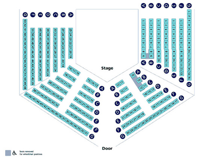 OK, we were in Row B right by the action and side on so could see both actors. But one had their back to that half of the theatre sitting at the sides of the thrust stage. That was true in all the dialogues there. We’ve sat at the sides and it’s sometimes problematic seeing action at the front of the stage area, let alone beyond the front into the entrance. We’ve also sat at the top of the stage facing section, the rake is steep, and you can’t see down into the entrance area. Look at the picture. More often they were with one with their back to the audience. In sections, one was sitting on the boxes bottom right, which is well into the entrance passage.