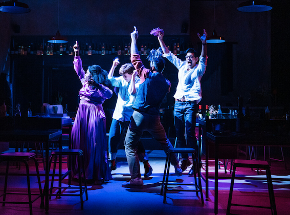 The best bit of the play by a mile is in act one. The lights flash on and off, columns of flame erupt from every table, Toxic is playing and the cast are caught dancing on tables or whatever with perfect timing and lighting. Toxic is ten years earlier (2004 hit), if we assume that ‘now’ is 2023 and they were at ‘uni’ ten years earlier, but then it’s stayed popular and when I was 21, we really loved songs from when we were fourteen / fifteen. At this point I thought the direction and choreography of action and lighting were superb.