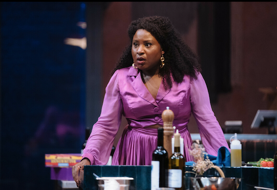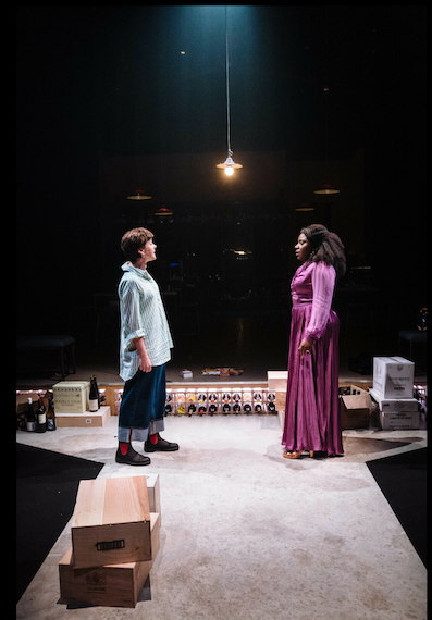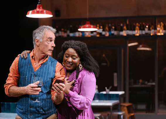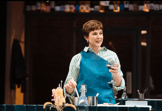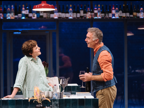 I couldn’t believe that any director had made that choice. What happened to watching a rehearsal and moving round the theatre checking the action, lights and sound clarity from different areas? We have seen the director do that on early performances at the Wanamaker Playhouse, let alone a rehearsal. Mind-bogglingly direction and set design. The issue is they need a wine cellar, and have steps down at the rear stage left. They need the street outside which is at the rear of the set. Right. It’s simple. There is a joke noise of falling down the cellar steps. Sorry, you have to lose that. The wine cellar is not literally a cellar in most restaurants, is it? There was room at the rear stage left to have a wine cellar as a climate controlled room with glass doors (like real restaurants). They have conversations in the street outside, stage right. They could have the wine cellar (wine store?) conversations in a room stage left.