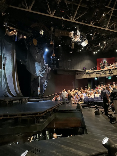 There is an outer ring walkway right at the edge, which surrounds the grilled over orchestra pit, with the orchestra itself right below the stage. This is unusual for Chichester. The orchestra are usually up above the stage, with the conductor visible to the cast on monitors in the auditorium. Here he had his head sticking up in the middle, between stage and circular walkway. I reckon he needed to be able to watch the action, especially when Simon Lipkin as Fagin did Reviewing The Situation, with stops and starts. OK, but we were in the front row (the musical is always the first play I book on the Chichester Friends booking). The conductor was lit, and mildly irritating to have just outside our eye line. (He mouths along to the words too!) I reckon right in the centre, six or seven seats to our right, it would have been really intrusive.