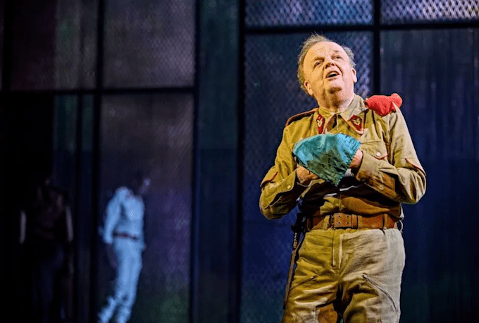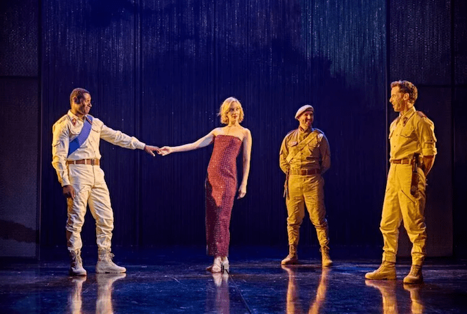 The modern dress is very well done – instead of raiding the props store for another set of army surplus uniforms, the design has created a uniform that is unique to the production. The other costumes blaze out. Scarlet for the senators of Venice, green for Desdemona, strong bright blue for Othello at the beginning. It’s harder to see in the production photos, but Iago’s uniform is light brown. The senior officer like Othello and Casio have white uniforms. As I’ve criticized Ms Akbar above, I will quote her point on the set: