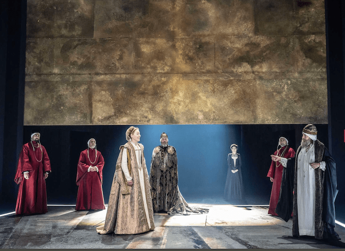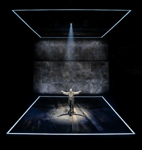 The width of the stage is used, the primary style is declaiming forward. Right at the beginning, outside Brabantio’s house, they speak straight forward as if Brabantio is at the back of the auditorium, but in fact Brabantio is up on high behind them also speaking directly forward. There is a lot of declaiming straight forward, or widely separated from other actors, rather than interaction. It is a strong style choice. A lot of speeches are delivered with actors rooted to the spot, lit and not looking at other actors.