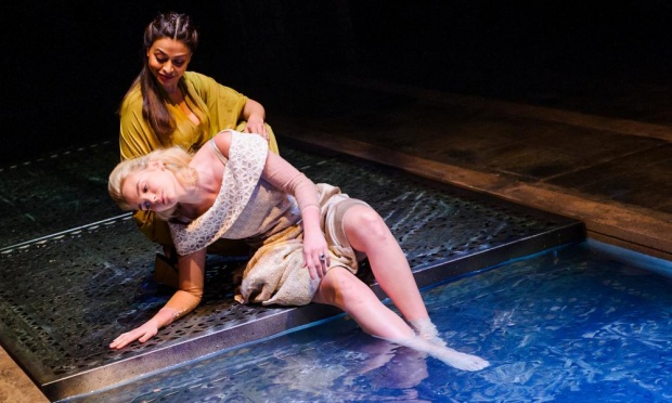 A production irony is the magnificent set. It starts as Venice with a gondola on water, flies in a golden roof for the Doge of Venice’s chambers, drops in a shattered church window for Cyprus. All great stuff, but it makes you wonder why The Merchant of Venice, sharing the same stage just the day before, avoided all of that Venetian ambience. Water carries through, with two large grills over the pool that can be raised to form conference tables, or platforms. Othello’s overhearing scene (Iago and Cassio) has him crouched in the water beneath the platform. There is a lengthy torture scene where Iago is supervising waterboarding a prisoner, while Othello calmly looks at paperwork to one side. This is, needless to say, not in the text. It’s a Gulf War / Guantanamo reference, and serves here to show that Othello is quite used to violence in his profession … we already knew that about Iago. As the tortured one has a black hood over his head it could be any member of the cast. I doubt they’re queuing up to play that one. I wonder how people who have been in the armed forces feel about their theatrical depiction. It seems a knee-jerk reaction to first put people in Desert Storm colors then have them looking around for someone to torture.
