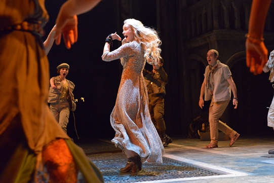Comparisons with the last big production, with Rory Kinnear as Iago at the National Theatre in 2013 are inevitable. Both use desert-coloured modern uniforms, and emphasise soldierly comradeship in long drunken scenes at a modern military base. While the National went for realistic … Portakabins and a portable toilet block for that overhearing scene, this is a hyper-real world. The costumes emphasize that. Everyone’s battledress is slightly different and the details are like no known army. The shades of khaki, beige and white are not uniform either. So while it all reads “contemporary battledress uniform” it’s in its own world. The civilians emphasize this. The Duke of Venice (played by a woman, Nadia Albina, who was Nerissa in The Merchant of Venice) is in wonderful silver robes. Desdemona is in long dresses. Emilia in bright orange then in yellow.