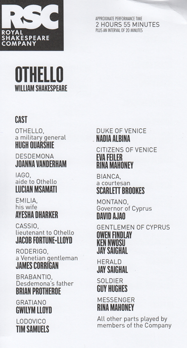 It has been placed with The Merchant of Venice as part of 2015’s “Outsider” theme. That means most of the cast act in both plays. The main characters escape these double roles, so Shylock, Antonio and Portia are only in the The Merchant of Venice. Similarly, Othello, Iago, Desdemona and Emilia are only in Othello. I enjoy seeing the RSC in rep … it really is “Spot the stars of 2016 and 2017.”