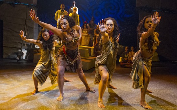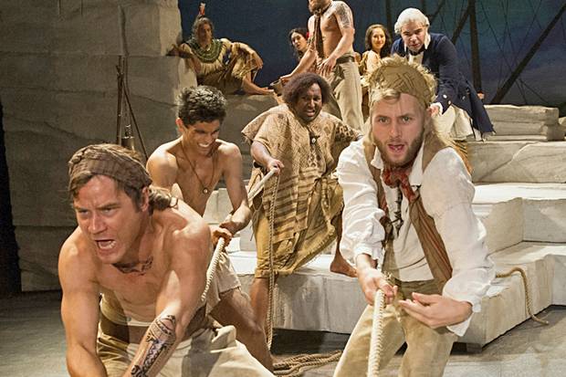 The cast deserve accolades all round. Tom Morley plays the politically advanced, but duplicitous Fletcher Christian, setting up this Rousseau Utopia with a (reasonably) willing set of Noble Savages. Ash Hunter is Ned Young, the seemingly religious other officer, and one of the villains of the piece. Samuel Edward-Cooke plays the shaven-headed violent Scot, Quintal. He’s fresh from Titus Adronicus at the Globe, and full marks to this director for being restrained with the stage blood for a change. The women succeed in looking Polynesian and work together so well as an ensemble.