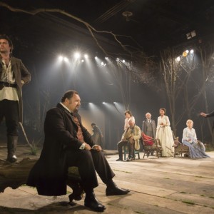 The scene ends with the characters assembling on the island for a picnic while Platonov and Sofya talk … Act One ends with a marvellous piece of theatre. There’s a back screen for projecting sky and sunsets to one side, and they troop off one at a time in single file, silhouetted against the evening sky. It’s a triumph of lighting design.