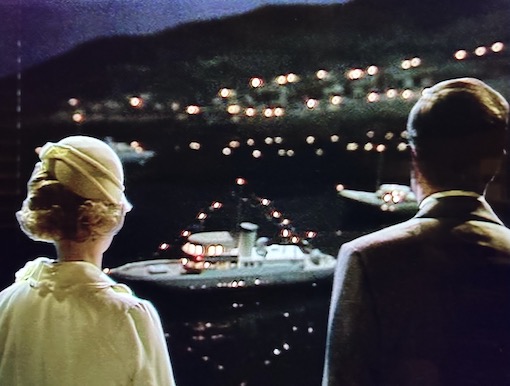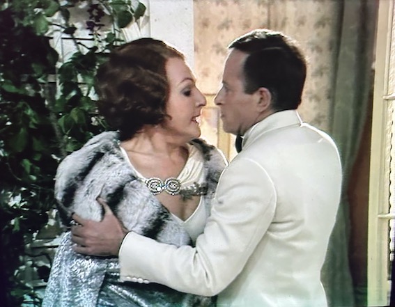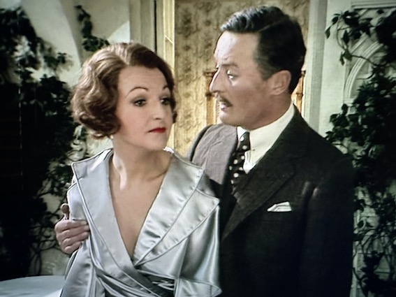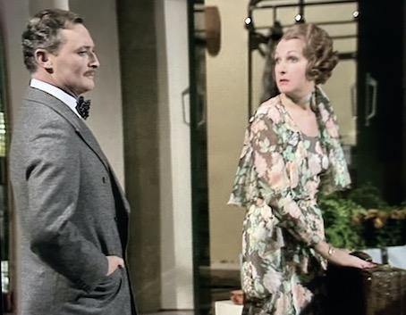 Once they’ve gone back into the room, we switch to the neighbouring balcony. Then we find Amanda and Victor have arrived at the same hotel for the first night of their honeymoon, and they discuss her first husband Elyot. While Sibyl is sweet, Amanda is toweringly glamorous. Sibyl’s primrose yellow going away outfit contrasts with Amanda’s silver, silken and revealing dressing gown.
