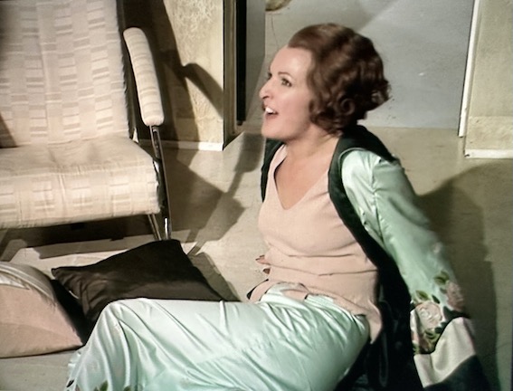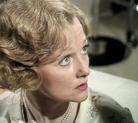 The morning after. The maid, Louise (Françoise Pascal ), comes into the dark room, tripping over the light the fight had knocked over. Her opening word is Merde! which Noël Coward couldn’t have got away with in English, and she continues in French. She tidies up, then sees Sibyl who wakes. Note the effectiveness of tight close ups: