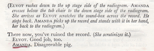 Right, that’s what’s happened in recent productions. Great moment. On the 2023 Donmar Warehouse review I commented that The Guardian was wrong about shards of ‘vinyl’ flying, because vinyl is unbreakable in that situation. It’s a 78 rpm shellac record. They break readily, though I wouldn’t guarantee every time on a blow to the head at all. Also, on Elf and Safe Tea, it’s a bit close to the eye for shards of shellac to fly. I would guess it’s a doctored / fake disc on modern stage productions, which means the record playing is sound over, not the actual record. I thought back to doing Private Lives regularly for ELT students in the 70s. We never broke a record. Too risky? Too unreliable with a standard shellac 78? It led me to the Acting Edition. We kept one copy from each set we had, and I note we kept Amanda’s copy.