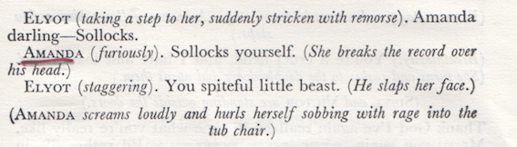 In Act 3, we are surprised that Victor refers to Elyot by surname as ‘Chase.’ Yes, that’s the text and what a 1930 Victor would have done, but as his discussion with Amanda in Act 1 always calls him ‘Elyot,’ it’s perplexing. Who remembered his surname? Was it mentioned? Our French’s Acting edition has ‘Chase’ crossed out and ‘Elyot’ written in. We were not alone in changing it for clarity.