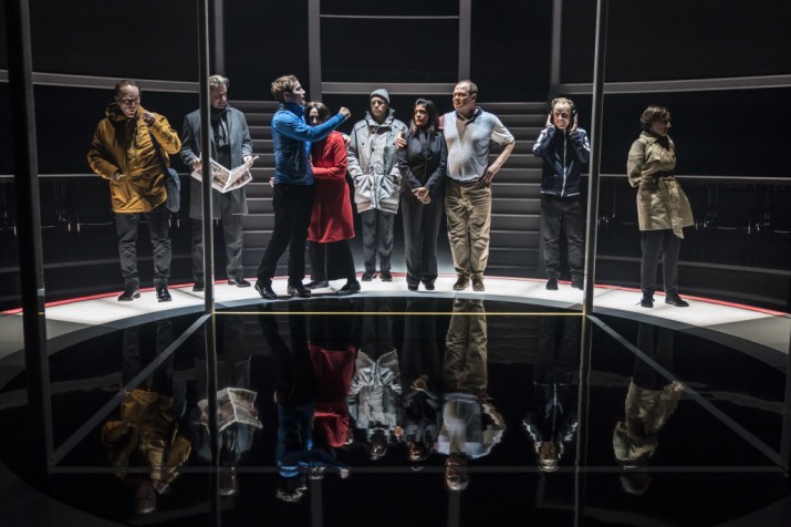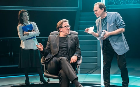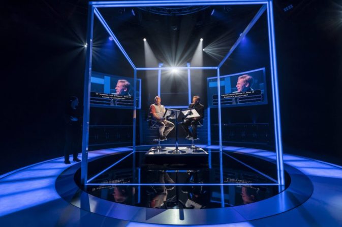 The set is a circular stage, which contra-rotates, with a neon cube on it. At the rear are ten seats for actors as would be contestants, and stairs leading up to a balcony which is where the judge appears. I was 100% sure it was designed by Alex Lowne, because it was so extremely similar to Dedication- Shakespeare and Southampton at The Nuffield Theatre, but no it was by Robert Jones. The lights can change in the cube or on the outer rotating ring, so for example when Ingram at home walks round with a lawn mower, a section lights up green with each step. Highly effective. A minor grouse, from our top row seats in Row G several speeches from halfway down the stairs had a neon line of the top of the cube right across the actor’s face. That would be remedied, I think, by the actor simply coming one step lower on the stairs.
