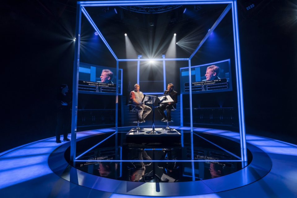 The continuing story of Tecwen, Adrian, Diana and Charles is intercut with the court case and in Act One, with a history of quiz shows with a reprise of old TV quiz shows like Take Your Pick, Bullseye and The Price Is Right with impersonations of the original TV game hosts. We start out though with a pub quiz in a Midlands pub. There is additionally the story off how the programme’s creators persuaded ITV to produce Who Wants To Be A Millionaire? (fascinating) and how it went global, with versions in 160 countries, in some of which it is still playing. There’s also the story of how, a year or so in to the programme’s run, ITV broadened the appeal. Too many middle class quiz enthusiasts were competing, and they wanted more working class competitors, so they added popular music and popular TV questions. It was apparent that they could also tailor questions as the quiz was in progress.