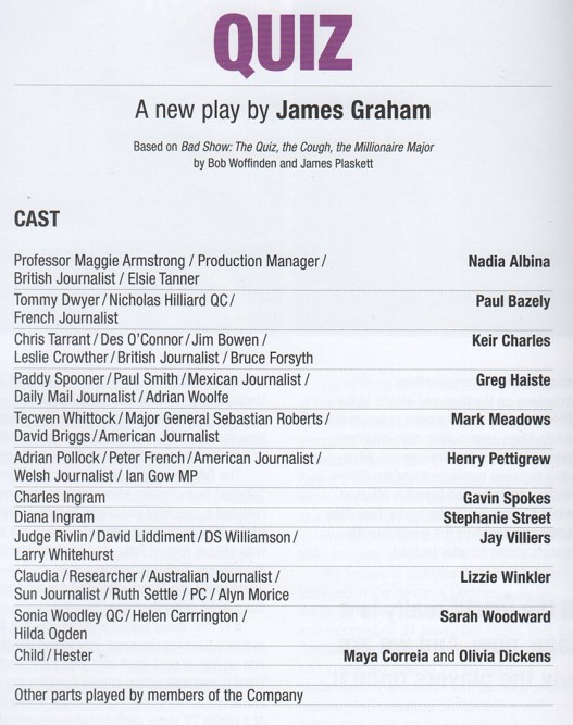 This play is based on Who Wants To Be A Millionaire? the quiz show, which was hosted by Chris Tarrant. It’s a true story. In 2001, Major Charles Ingram became the third million pound prize winner. His brother-in-law Adrian Pollock, and his wife, Diana Ingram had both competed before, and both got to the £32,000 prize. Adrian had worked out the issues were (a) getting through on the phone to apply (which is where the TV company made its premium rate call money … Diana had spent £600 trying to get on the show), and (b) being fastest to answer the question to the eight or ten would-be contestants, which was always ordering four facts, A, B, C and D. Adrian built a machine to practise pressing the four buttons at speed. The rules only allowed one appearance, and Diana persuaded Major Ingrams to apply and coached him.