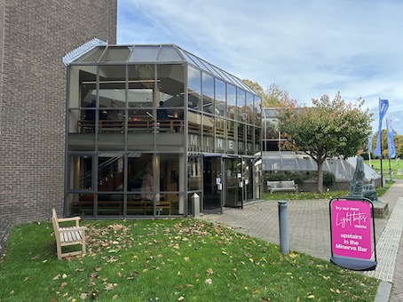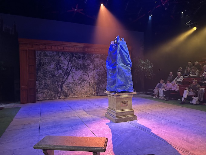 The set is extremely good. We have an inner stage which serves as Connor and Isaiah’s room, then a corridor in the university, and then Omar’s room. It slides in and out. For Omar’s room, a further platform slides out to show his larger single room with more furniture. Changes of scene in the inner stage are elaborate and must require rapid and silent work froim the stage crew. The statue is in the foreground. Note that grass surrounds the patio (astroturf), and the photographic backdrop with trees and doors. For the patio scenes, a cloth with trees covers the inner stage. When the initial blackout starts the play, we were amazed when the lights went up to reveal the statue had gone. It will come and go during the play. (It’s on a silent track).