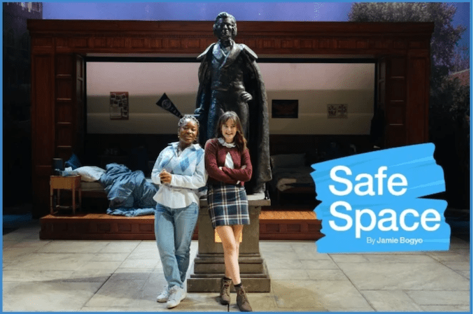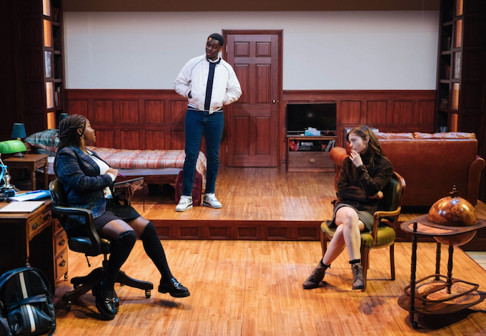 The play is about the relationships more than politics or political correctness. It’s a very real American issue. Black and white. Connor is white, proudly voted for Obama, but feels that Yale is full of tradition, and that the name should not be changed in a PC surge. For this he is seen as conservative, right wing. His room mate Isaiah, is black. He didn’t vote for Obama, giving up when he saw three hour lines … an aside on deliberate efforts to obstruct voting in African-American districts perhaps. Isaiah is the voice of reason, at least to me. While the campus, as personified by Annabelle, Stacey and Omar (Ivan Oyik) are intent on changing the college name, Isaiah reckons you can’t change history. You can’t pretend it never happened, though you can annotate, you can give it context. I’d rate Isaiah as the most sympathetic character. Connor describes Isaiah as his best friend, but throughout the play there is edginess from Connor and Annabelle. Is their friendship with black classmates tinged with desperation to show no prejudice, thus inadvertently patronizing?