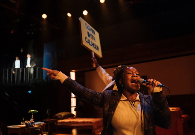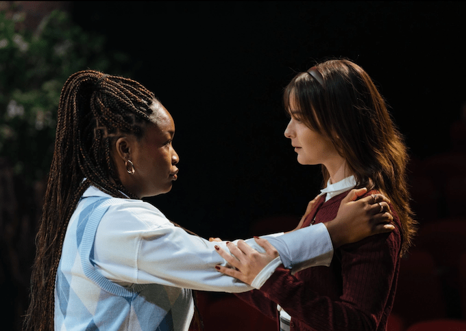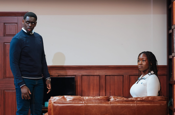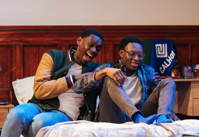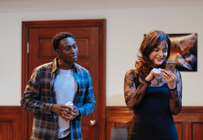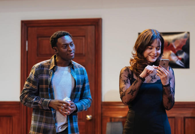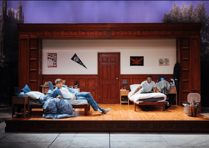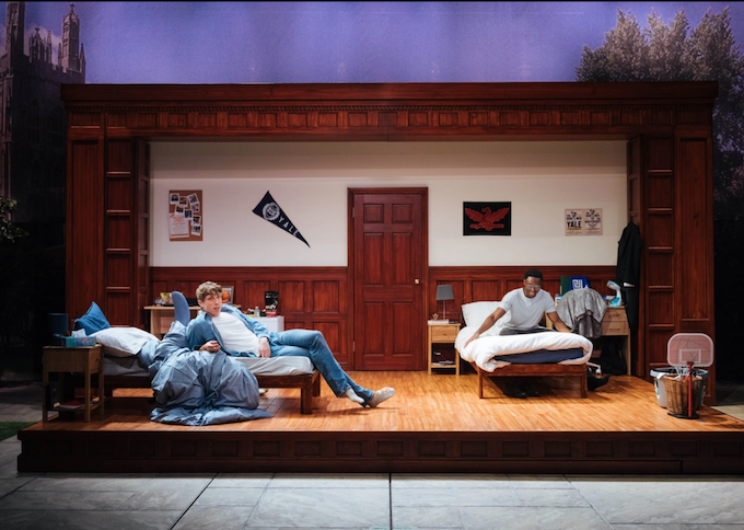 A theme is university clubs with the room mates, Connor (Jamie Boygo) and Isaiah sharing the desire to be Whiffenpoofs. Then the two girls, Annabelle (Céline Bucken) and Stacey (Bola Akeju) are in competition for the Women Leaders Society (? Memory- there was no play text on sale) not that Annabelle who thinks her election will be a shoe-in, knows that Stacey is applying too. Stacey is only a freshman. This is an American theme with leadership of clubs and societies being a major c.v. point. I’m somewhat surprised that they don’t bring in fraternities and sororities too as that’s an Ivy League institution, and students have to be voted in like Freemasons and can be ‘blackballed’ so refused admission. I can relate to it in British terms. I was elected President of the Drama Society and my defeated opposition was a mature student, who though ten years older, was immature enough to plaster graffiti about me around the campus. There can be a lot of angst about these society posts, as in the play.