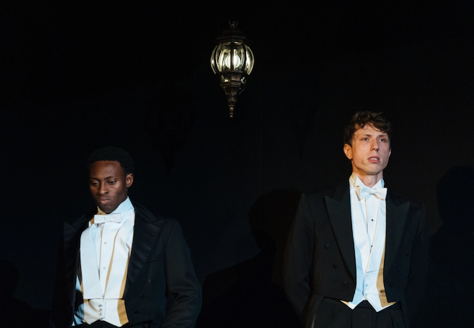 The programme has an extensive and erudite note on a cappella singing groups in American universities. Yale’s Whiffenpoofs are still going. Cole Porter was a member of the 1913 version. The play is bookended with a cappella. It starts with a spotlit song with lead vocal by Isaiah (Ernest Kingsley Jr) in full white tie and tails, accompanied by the other four on high platforms either side of the stage, backs to us. This runs through. As he stares at the white gloves, my mind went to minstrelsy, or the Black & White Minstrels.