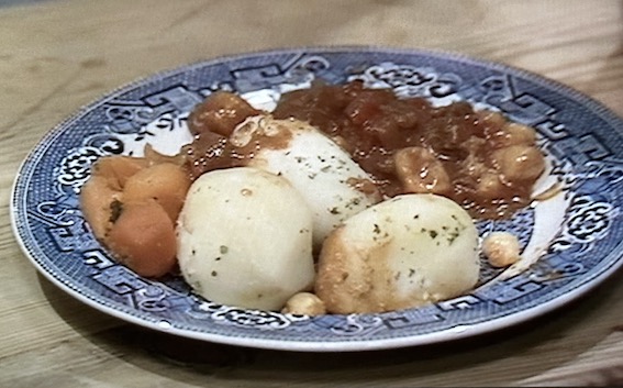 The hotel food close ups, slopped on the plates, evoke the school dinners of my youth. They’ve added a cook to slop the food on (and added a few lines).