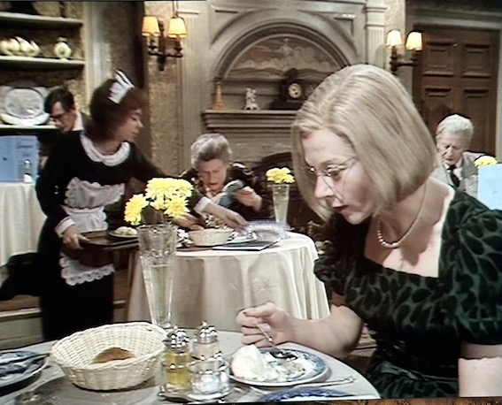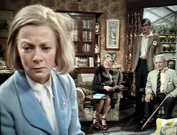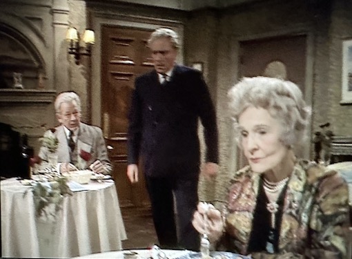 So what makes the BBC play adaptation different? The eighteen month gap has been removed, so the two plays run as one, with an evening sequence for the first, and a morning sequence for the second. In the second, for much of it, the “tables” are also in the conservatory. Therefore, the young couple with a baby from the second play, can now appear at a table in the first and have a couple of lines. More, our leads appear in both halves … though due to 1970 technology, never appear together. So the end sections of the first play are cut into the second play. Geraldine McEwan appears as Sybil in the first play at a table, goes out and soon arrives as Anne.