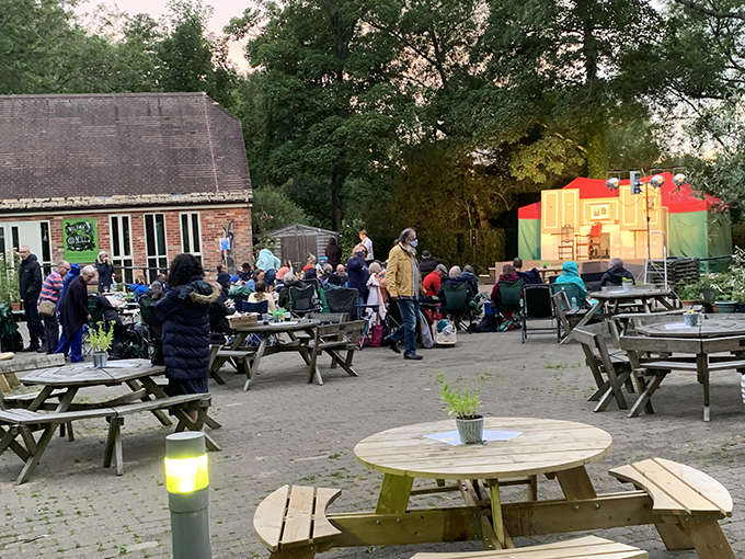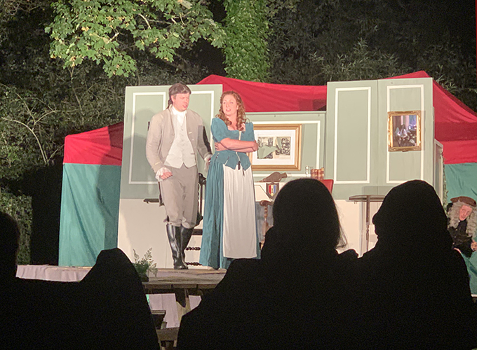 You can only play it large in the open air, and with the odd motor-bike crossing the bridge nearby (and the inexplicable decision by Walford Mill to clean the toilet block during act one), you have to use volume. Social distancing also means we took up a much larger area of the Mill courtyard than we would have done in the past, when we’d have sat in rows closer to the stage. It means it’s harder than the encircled Shakespeare’s Globe to project in the open air and they all managed well.