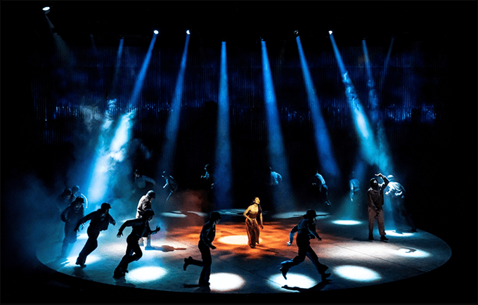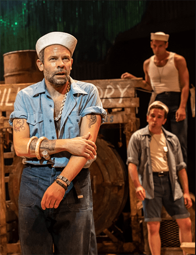 Chichester is three-quarters in the round, and for this they had a revolve stage, which they used a lot to great effect. The orchestra are hidden away above the stage. A cast of thirty-one on stage. They used a vast array of costumes, all clean and freshly pressed, meaning they have multiple sets, what with matinees.