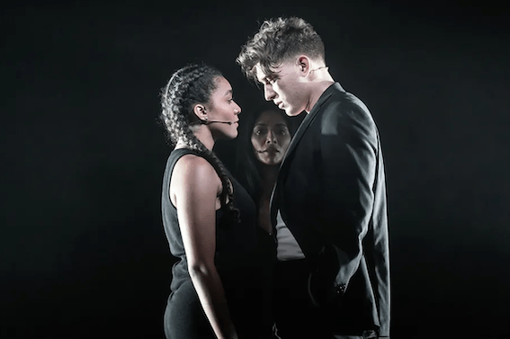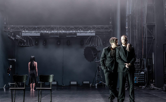 The concept is Jamie Lloyd’s and it is bare stage, no furniture, black and white costume, silver screen. We are in film. The only colour we see on the cast is the flash of red blood on Joe right at the end. For cinema buffs, in Eisenstein’s Battleship Potemkin the only colour in a B&W film, is the red of the Soviet flag as it unfurls at the end. As colour film had not been invented, this was hand painted in frame-by-frame on every print.