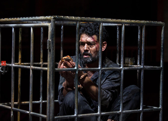The whole cast, switching as various lords and kings deserve the highest accolades. I’ll single out Sagar I M Arya, who plays Bajazeth, Emperor of the Turks, and Debbie Korley as Zabina, wife to Bajazeth because they have so much humiliation heaped upon them in their roles. Bajazeth spends much time in a small cage, fed scraps of meat by Tamburlaine, while Zabina has to hobble around in rags and ankle chains as a servant to Zenocrate’s servant, Anippe (Zainab Hassan).