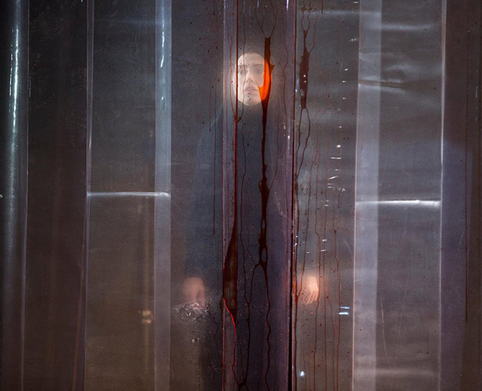 In Part Two Zenocrate dies, then the dead body is carried around with Tamburlaine until his own death. The dead body is her sitting absolutely still in a wheelchair (for long periods too-try doing it!) Having died, Rosy McEwan becomes the grown up slave, Callapine, son of the Turkish king. This is done by the child Callapine handing over his chains and his bucket of blood and paintbrush. She then becomes the adult Callapine. It’s an odd move (the cast is large enough to have simply cast someone else) so must have an idea behind it, which escapes me. She then has to switch between the two roles, both dressed all in white.