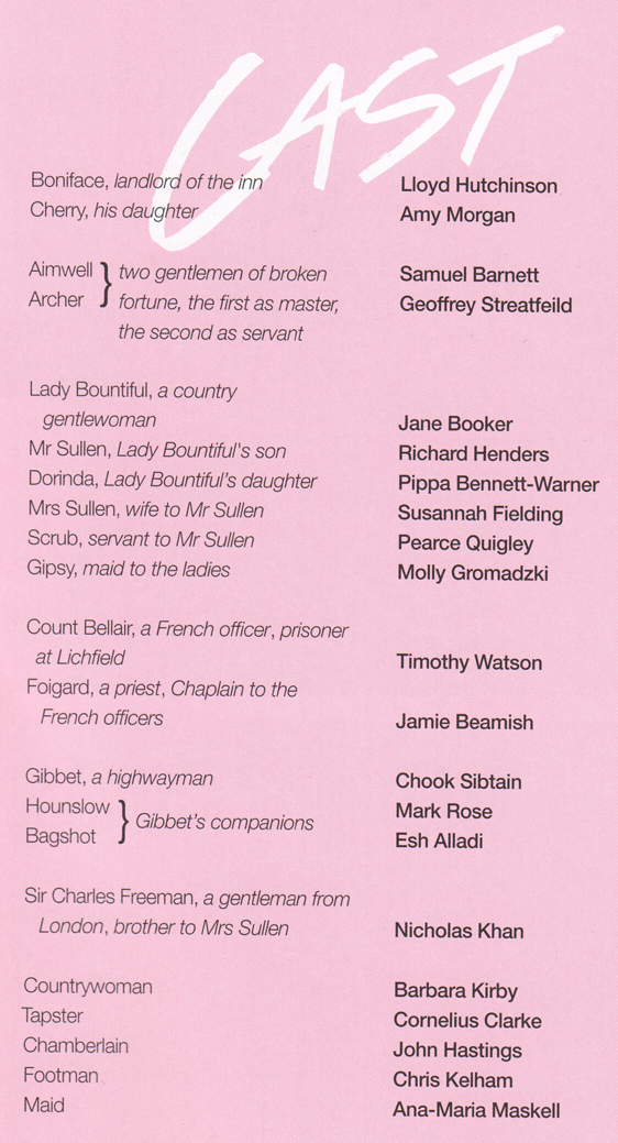 The bigger a part was played the better. Gibbet the Highwayman’s first appearance was memorable because he produced booty from all over himself like a magician. Really well done. Naming his assistants in crime Hounslow and Bagshot is so intrinsically funny now that I had to check the script: it was funny in 1707 too.