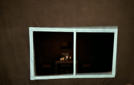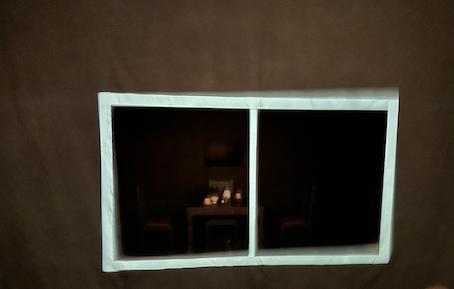 Oddly, in all the production photos except the one above, the back wall looks lighter, a different colour. Did they later decide to have it all brown, or is it a lighting effect? Then in the photos the window frame is blue. It was white when we saw it.