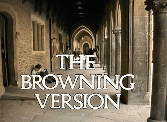 The play dates from 1948, when it was performed as a one act play, followed by Harlequinade as the second act. The pair were called Playbill. It’s a strange combination. The pairing requires two radically different sets. The Browning Version is sad, poignant, and said to be Rattigan’s favourite among his plays (Michael Billington chooses The Deep Blue Sea as the best in 101 Plays.) Harlequinade is a farce. They were played by the same cast, so Rattigan was in the same mode as the later Separate Tables, stressing the range and versatility of actors. Perhaps he wanted to depress then lift the audience … we watched The Browning Version, then after a break, watched an episode of the original Frasier to cheer ourselves up. In recent years, the tendency is to perform the plays separately, though they are in one volume in print (labelled ‘The Browning Version’ on cover and spine). Kenneth Branagh paired Harlequinade with the solo All On Her Own. Like most Rattigan plays The Browning Version went swiftly to film in 1951. Then it was redone in 1994. Both were padded out with exterior shots to extend it beyond its 75 minutes stage time. This version dates from 1985 and starts with a minute and a half walking past a cricket match and through the school.