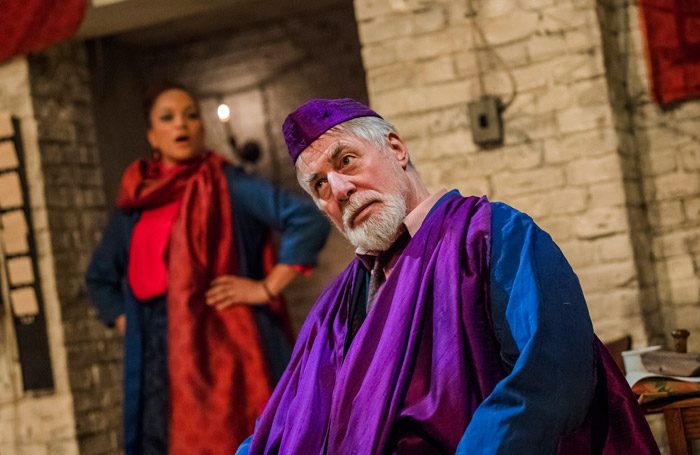 At the start Barrie Rutter comes on as the floor sweeper, with Angela Griffin as the tea lady. No lines. Anyway, the whole mill framing device is run out in about two minutes, abandoned and never referenced again till the very end (very funny, no plot spoiler). Except that the warlike Morat brandishes a monkey wrench instead of a sword, a sudden reminder of a setting we had forgotten. The mill setting or frame is a total waste of effort. The cast are in overalls / mufti (an Indian word) dressed up with bright scarves or cloaks. An awful choice, when a great deal of money has been spent (or rather totally wasted) covering the Wanamaker Playhouse’s mock-17th century interior with white brick to look like a dyeing factory. Any sensible designer would have kept the ornate Wanamaker background just as it was and spent the money on glorious exotic Mughal costumes instead. That mill frame piece does nothing, even if it is realised well with pipes, a clocking-in machine and a framed photo of the Queen and Prince Philip.