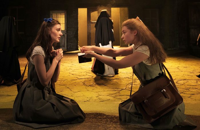 The story takes Caithleen from the death of her mother, drowned while fleeing a beating from her drunken father. Then she’s at convent school, with her friend Baba. The nuns are vicious … she has her mother’s photo confiscated. She is befriended by a novice, but the brutal regime of the school bears down on them after a scurrilous verse written by Baba is found. They’re beaten and expelled, and go off to Dublin. They live with a sweet elderly Jewish couple. Baba is after the fast life with ageing local “spivs.” Caithleen is pursued by an older married man from her village, the oddly named Mr Gentleman. She agrees to go off to Vienna with him for a few days (borrowing a nightie from her landlady), but he betrays her, staying with his wife. Caithleen is drenched in a rainstorm … the Minerva Theatre is very fond of its fine rain machine and uses it often. She is rescued by The Poet who takes her home. Mr Gentleman arrives to apologise, but Kate is off to LONDON!