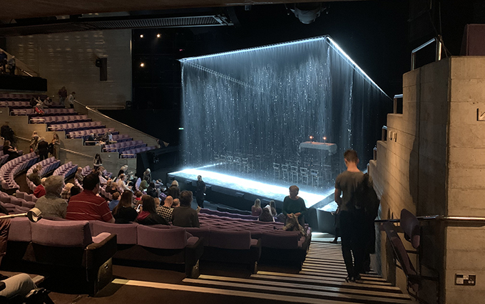 It started us both on an old, old rant. The amount of money The National Theatre lavishes on productions. It came to the fore with the great mass of extravagantly costumed knights a few years back in King Lear, but it really seems to be ‘money no object.’ The rain is an effect when you come in, right at the start and between acts. Otherwise it has no function. How much did it cost to build and pump, and pump away? It might not have been that excessive overall, as the rest of the set is just plain old tables and chairs with no back set at all. However its only purpose was pre-show, initial impact. There is no dramatic reference to it. I’m not going for Grotowski’s Toward A Poor Theatre, and we loved the elaborate set next door in the Lyttelton Theatre for Blues For An Alabama Sky. But we’ve watched producing theatres like Southampton’s Nuffield fail, or like Salisbury Playhouse, cut back on original productions. I feel that Arts Council money could be shared around more fairly, and for starters, London should be capped at the proportion of the funds equivalent to its population. Of course, opera deserves the biggest cut … no, slash … in its budgets. Every opera seat is heavily subsidised beyond any theatre.