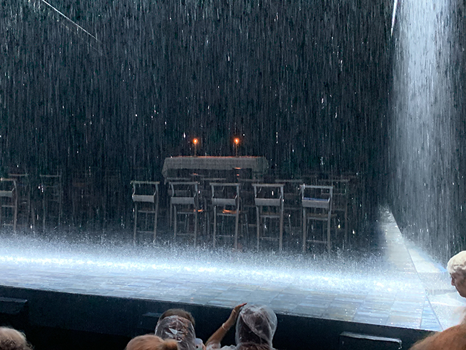 The stage is surrounded on three sides with rain as you come in. Rain punctuates the acts. There are elaborate drains at the sides, and the front row are issued with plastic macs. I’d be more worried about three hours on a wet seat. When the play starts, some of the girls have to get down on their knees trying to dry the acting area with cloth.