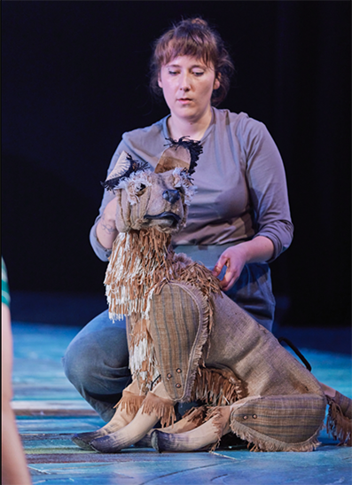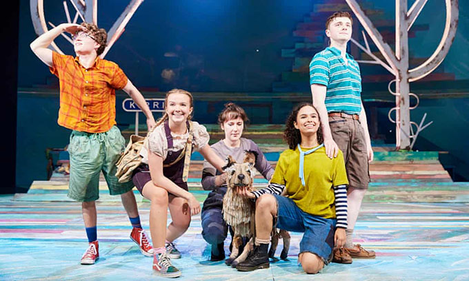 The first issue is how do you do the fifth member, Timmy the Dog? Is it an actor in costume (Dick Whittington’s Cat, or Nana in 2016’s Peter Pan Goes Wrong)? Is it a real trained dog used minimally (the 1997 play)? Here it’s a puppet.