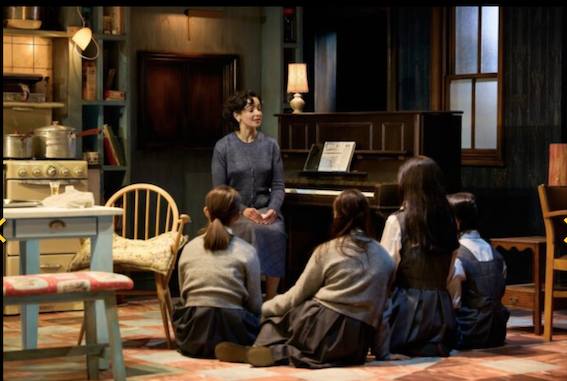 The stage revolves fully to reveal a kitchen, the time changes to 1955. The new young cast of sisters takes over in gymslips. They sing the old Johnny Mercer song the Hills of California, from 1948. We meet the young Veronica of twenty years before … played by Laura Donnelly. She is the ultimate stage mum. Oh, I’ve met them. I worked on the Ken Dodd show and every one of The Diddymen (girls 12 to 14) had one with them.