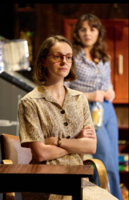 The stage revolves to the 1955 kitchen. It’s been decorated like a church hall stage with fairy lights. The kitchen table is the stage. Joe, the pianist is late, to Veronica’s anger. Jack has come good. He is bringing the American manager, Luther St. John (Corey Johnson), to audition the girls. Veronica burbles away- there’s a key point again among this. The Andrews Sisters were a trio. The Webb Sisters are a quartet, but one can be dropped as not as good as the others, but kept on as an understudy. Yes, its Gloria who is droppable. The audition piece with kazoos is Boogie Woogie Bugle Boy.