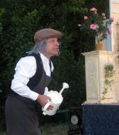 Gwendolyn (Pippa Meekings) and Cecily (Claire Tucker) both shone, particularly in their interaction scene. Perfect costume helps, but they played extremely well together, especially in the tricky unison bits. Miss Prism wasn’t the prim but timid lady we’re used to. She was played sexier and bawdier, virtually getting into slap and tickle with the rather randy reverend. It’s not how Wilde envisaged her perhaps, but again, it worked. This was a Bank Holiday weekend. All my childhood the big treat of a Bank Holiday was a Brian Rix farce broadcast live direct from the Whitehall Theatre. When you’re in the open-air with noisy birds in the trees, audible traffic and no theatre acoustic, pulling out the farcical elements was exactly right. The bit where the audience got inadvertently splattered with water must be a first for a Wilde play.