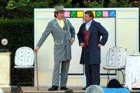 Lane, Merriman and Canon Chasuble were combined by Alec Gray who also acted as compere / announcer. The butlers often are combined, but I hadn’t seen the Canon worked in with them before. It was done by playing Lane as snooty as usual, and making Merriman a gardener with an unkempt wig, dashing on and dashing off. I approved thoroughly. Merriman has to get more and more fed up as he’s sent off to arrange the dog cart to take Algie to the station, then cancel the dog cart, then re-arrange the dog cart repeatedly. It is often done by playing him as an exhausted wheezing geriatric staggering off to try again, which slows the play, and though funny, focusses attention past the principals onto Merriman. I always thought you can pant and puff at the run rather than wheeze at the crawl, and that maintains the pace.