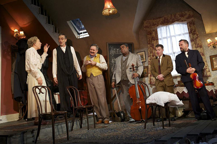 They make a major thing about the 1956 setting. But before the play and in the interval, the speakers treat us to Tiptoe Through The Tulips and Look For The Silver Lining in strangulated 1930s versions. Mrs Witherspoon puts on the lavender dress to remind herself of her own 21st birthday, at least fifty years earlier. But all her friends arrive for the recital in Edwardian frockst too. So why bother to have a prominent 1956 Daily Mirror printed up? What was Linehan thinking? It’s all “old”? Stephen Wight had a touch of velvet on his collar as Harry, but 1956 should be full Teddy Boy for the character. We assumed Ben Miller was doing a very poor Italian accent until two-thirds through we discover he’s a 1956 Rumanian crook, in a 1930s Al Capone suit. Rumanians didn’t get to England in 1956. And a Rumanian accent doesn’t sound anything remotely like that either. We have Rumanian friends. We’ve taught Rumanians.