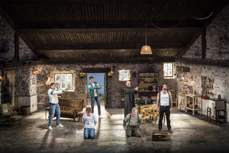 The Noel Coward is a high, four level theatre and proscenium stage, so a major change from the original in the round version at tiny RSC The Other Place. We were in the stalls and close up. In the top level at the back it’s a LONG way. I’ve done it. To compensate for the size, you get a beautifully detailed cottage interior from designer Christopher Oram, and an impressive front drop of a stylised tree in front of which we have the country road and the Northern Ireland warehouse where Padriag is torturing a drug dealer.
