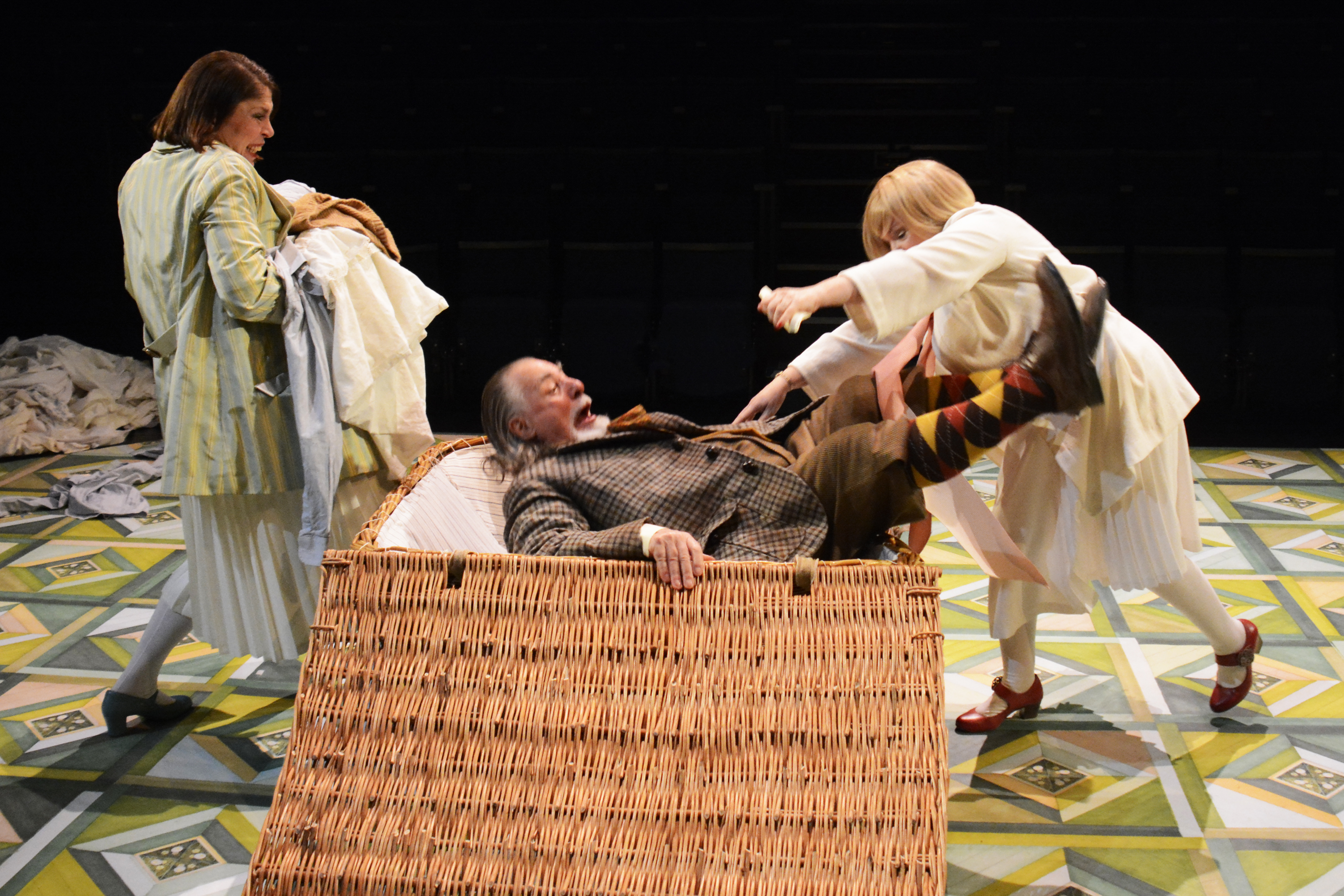 Rightly, reviews picked out the hamper scene, where Mistress Page and Mistress Ford conceal Falstaff below dirty laundry to hide him from the angry and jealous Master Ford. In the second seduction scene, where Falstaff has to disguise himself as the Fat Witch of Ilkely (a Yorkshire version of Shakespeare’s The Witch of Brentford), Ford furiously throws laundry items into the audience. A younger audience would have thrown them back.