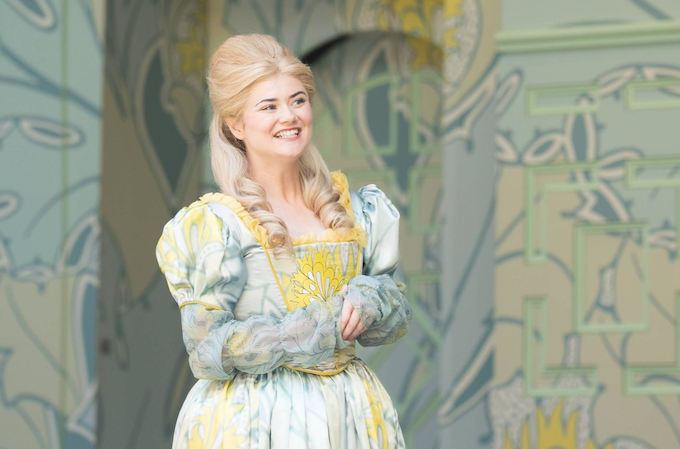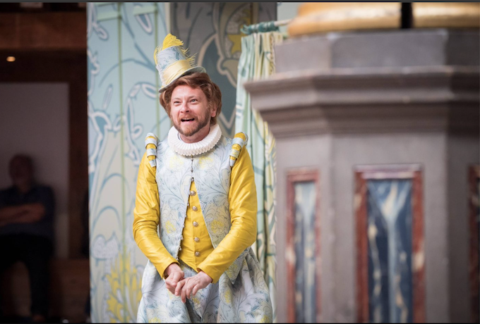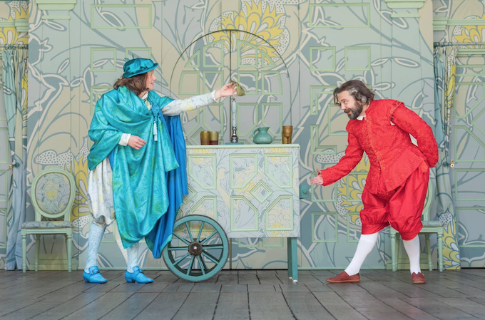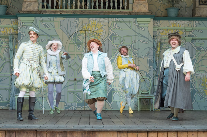 The set puzzles me. The Globe has covered the fabric of the building before, and two Sean Holmes directed plays stand out, Much Ado About Nothing set on a Mexican revolution era train, and Romeo & Juliet set in the Wild West. They both had solid reasons. Here? I can’t see that covering the basic Globe walls has any purpose at all. One review calls it a Liberty print – it’s not. Another calls it a William Morris design. It’s not. A third says specifically it’s Thibaut Windsor Spa wallpaper. That’s certainly very close indeed, though I can’t find the exact colour-way They may have done it for this. It’s a wallpaper pattern and costs £240 per roll. So what do the curtains behind the musicians cost? It’s echoed in the costumes which are colour coded, a good idea. The Pages have yellow, the Fords have light blue, others have green and Falstaff and his supporters and page boy have red. I didn’t like the silly hats on the Pages. However as the costumes are faux-Elizabethan (but much shinier and more subtle colours), I can’t see why they needed to cover the existing building. There is no furniture apart from Dr Caius’ closet (same pattern) and the laundry basket in blue.