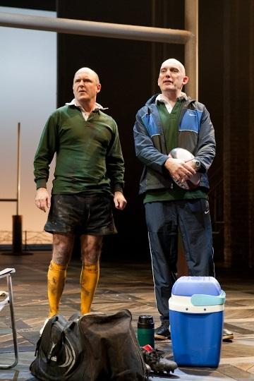 The hunter wellies appear in the rugby pitch scene. Master Ford first appears in mud-spattered rugby gear, setting the testosterone charged rugger-bugger character. Master Page has got a tracksuit on, and when the pub landlord turns up, he’s the referee. Ford was the chosen part of 19th century actor managers, so they rightly thought it the best role in the play, and John Ramm does the role full justice. The rugby start rang bells for me … John Ramm looked just like a guy I used to run into at the gym. When he wasn’t wearing a rugby shirt, he was carrying a squash racket and seething with competiveness. It’s such a good role because as well as the jealous husband, he has to pretend to be Brook, the man soliciting Falstaff to seduce Mistress Ford, giving him a change of character while still revealing his inner-Ford. The wig which slipped was a great moment.