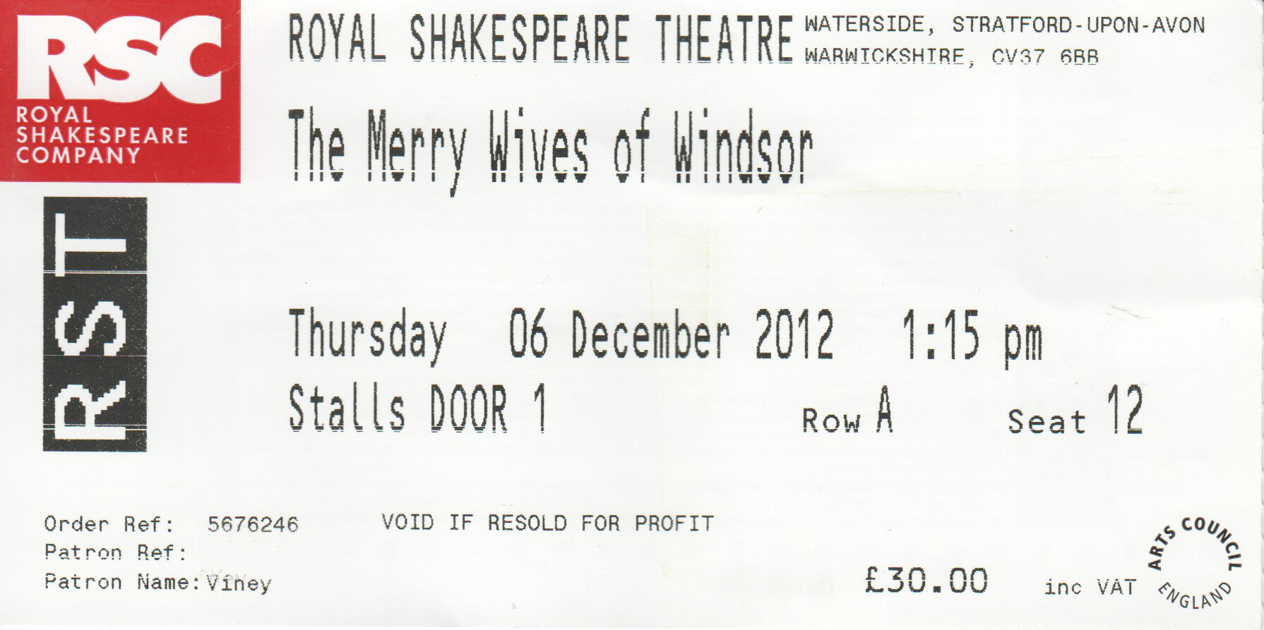 In another review, I wrote that in the early 60s, if my parents had been confronted by a quiz question saying name a Shakespeare play, The Merry Wives of Windsor would have been the first response. Just before going to see this we mentioned it to a neighbour (early seventies) who said ‘My favourite Shakespeare play! Not that I’ve seen one for forty years …’ I saw a TV production many years ago, and have never seen it on stage before. The clue to this comes in the RSC 2012 edition of the play. I’ve never bought their current edition before, as I have always had a single play edition already. With this one, I didn’t, and I’ve made a mental note to always buy them at the RSC in future, for the production history at the back.
