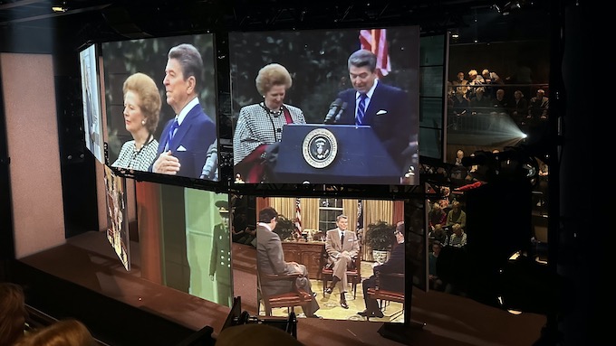 She has a signed copy of Margaret Thatcher’s book. There is a lot in the play on the election and creating an image ‘the Sunflower revolution.’ The projected film footage is elaborate. I have no idea of how they did it- and they did it very well too.