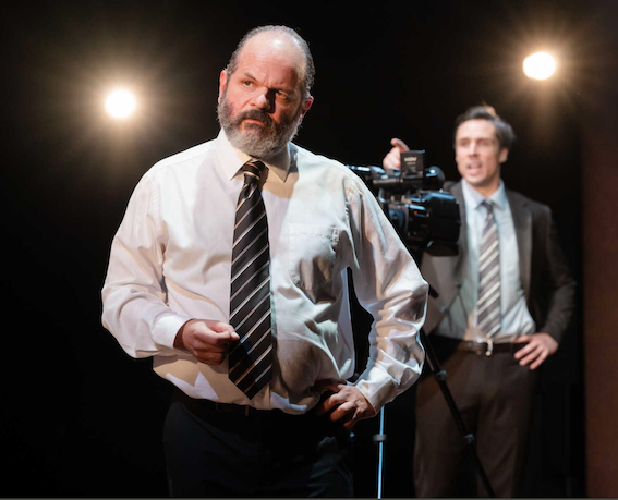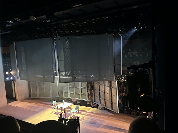 There are video projection screens in two segments. The lower half is raised to reveal the stage, lowered for set changes. The top half remains to form a photographic set. A hotel lobby, an airport, the presidential palace, a toilet. They can also be used for video, as when they watch a VHS tape, or we see collages, politicians who are part of the story making speeches, demonstrations or Putin and ruined Ukraine towns.