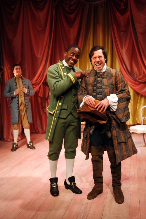 Jack Absolute (Ncuti Gatwa) & Bob Acres (Daniel Abelson), Faulkland (James Mack) at rear
